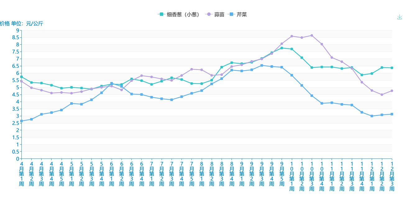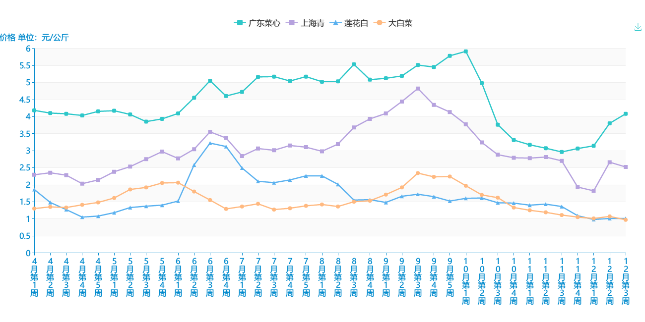 目前,各冬春蔬菜主产区仍处于采收旺季,受大范围持续低温雨雪天气影响,菜价渐入缓慢提升期,本周价格略有上升。