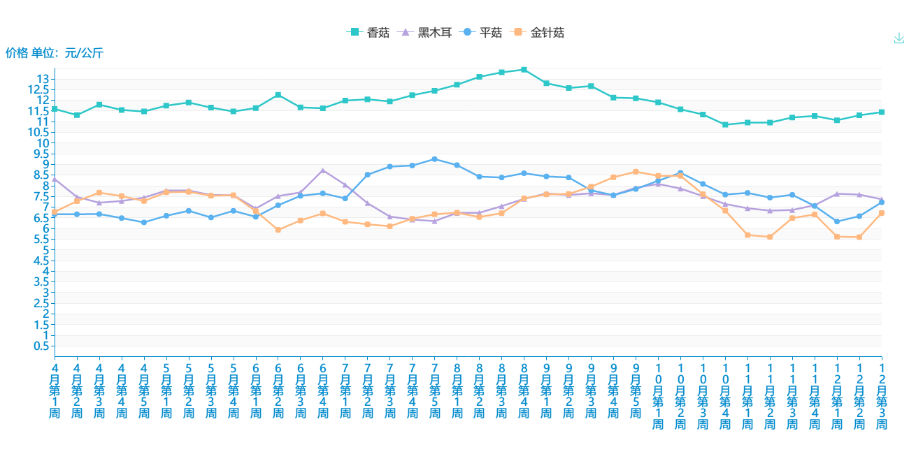 据全省9个批发市场蔬菜价格定点监测,12月第3周(12月16日-12月22日),22种蔬菜市场批发均价4.82元/公斤,环比上升1.47%,9种蔬菜批发价格上升,10种蔬菜批发价格下降,3种蔬菜批发价格保持稳定。其中金针菇价格上升较为明显,环比上升22.56%;白萝卜、胡萝卜价格下降较为明显,环比分别下降12.50%、13.39%。分品类看,叶菜类:大白菜0.98元/公斤,环比下降5.77%;莲花白1.02元/公斤,环比为0.00%;广东菜心4.16元/公斤,环比上升6.67%;上海青2.56元/公斤,环比下降5.88%。根茎类:白萝卜0.84元/公斤,环比下降12.50%;胡萝卜2.2元/公斤,环比下降13.39%;土豆2.16元/公斤,环比上升5.88%;生姜8.3元/公斤,环比上升6.68%;蒜头13.64元/公斤,环比上升2.56%。茄果、瓜类:中青椒3.14元/公斤,环比下降2.48%;尖椒6.66元/公斤,环比下降2.06%;刺黄瓜5元/公斤,环比下降6.37%;番茄3.66元/公斤,环比下降6.15%;茄子2.64元/公斤,环比下降7.04%;南瓜1.8元/公斤,环比上升2.27%。香细菜:蒜苗4.72元/公斤,环比上升6.79%;小葱6.44元/公斤,环比为0.00%;芹菜3.22元/公斤,环比为0.00%。菌类:香菇11.66元/公斤,环比上升1.04%;木耳7.4元/公斤,环比下降3.65%;平菇7.24元/公斤,环比上升7.74%;金针菇6.52元/公斤,环比上升22.56%。
