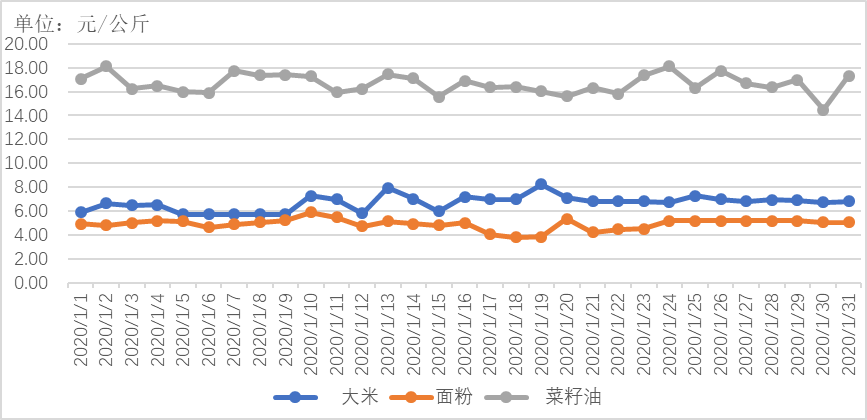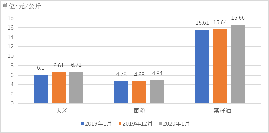图2.粮油类2019年1月、12月和2020年1月均价比较图