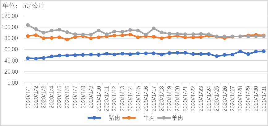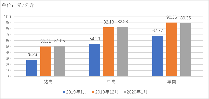 图4.肉类2019年1月、12月和2020年1月均价比较图