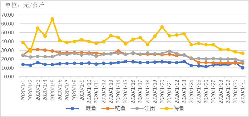 鲤鱼均价14.87元/公斤,环比下跌2.17%,同比下跌4.64%;鲟鱼均价41.08元/公斤,环比下跌2.39%,同比下跌14.99%;江团均价23.93元/公斤,环比下跌2.77%,同比下跌11.90%;鲢鱼均价24.15元/公斤,环比下跌6.99%,同比下跌2.29%。