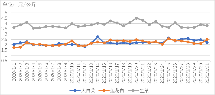 图7.叶菜类大白菜、莲花白、生菜价格走势图