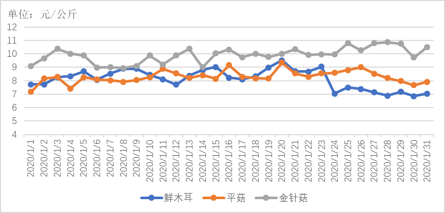 3种食用菌批发均价8.78元/公斤,环比上涨4.58%,同比上涨12.68%。其中,金针菇9.91元/公斤,环比上涨12.72%,同比上涨15.89%;鲜木耳8.13元/公斤,环比上涨3.88%,同比上涨13.11%;平菇8.29元/公斤,环比下跌3.14%,同比上涨8.67%。