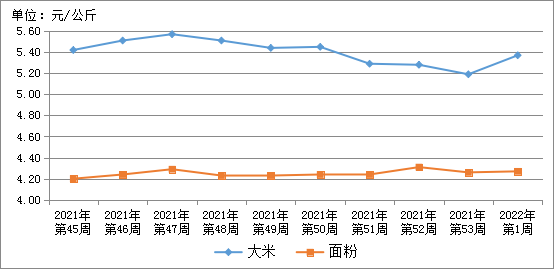 图1 2022年第1周大米、面粉批发市场价格走势图