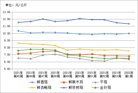 图7 2022年第1周6种食用菌鲜货批发市场价格走势图