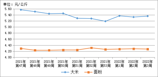 图1 2022年第3周大米、面粉批发市场价格走势图