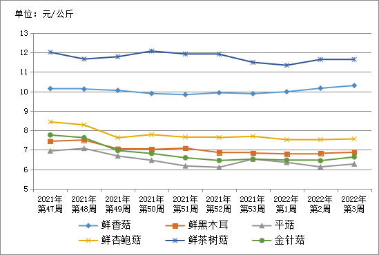 图7 2022年第3周6种食用菌鲜货批发市场价格走势图