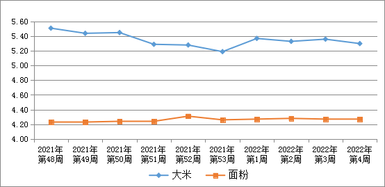 图1 2022年第4周大米、面粉批发市场价格走势图