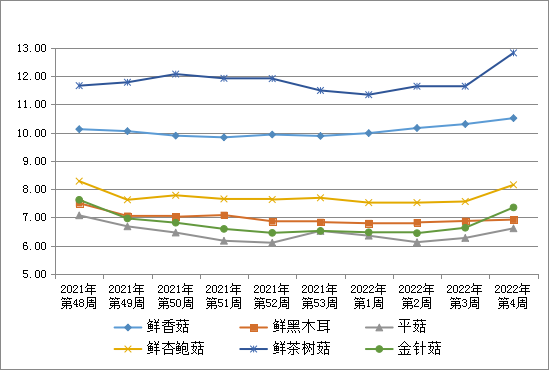 图7 2022年第4周6种食用菌鲜货批发市场价格走势图