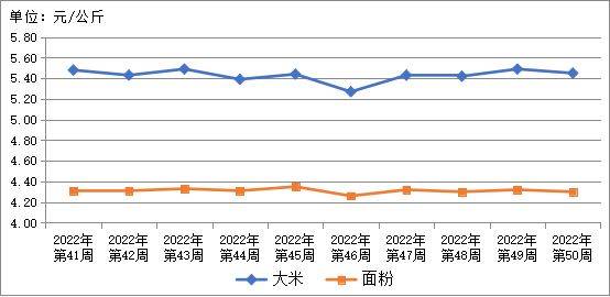 图1 2022年第50周大米、面粉批发市场价格走势图