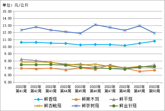 图7 2022年第50周6种食用菌鲜货批发市场价格走势图