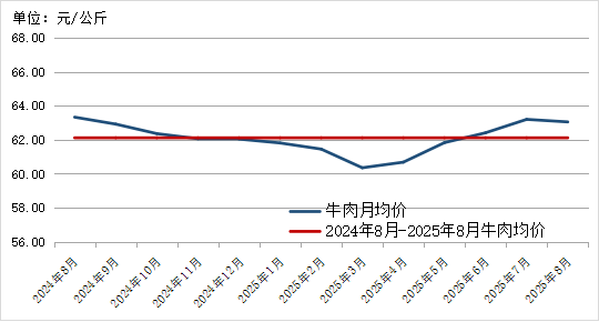 我省牛肉月均价63.05元/公斤,环比下跌0.24%,同比下跌0.44%。据农业农村部数据,全国牛肉月均批发价64.60元/公斤,环比上涨1.59%,同比上涨7.34%。