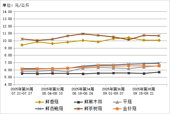 图8 2025年第39周6种食用菌鲜货批发市场价格走势