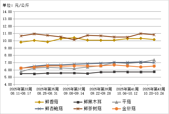 图8 2025年第43周6种食用菌鲜货批发市场价格走势
