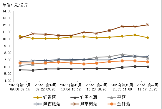 图8 2025年第47周6种食用菌鲜货批发市场价格走势