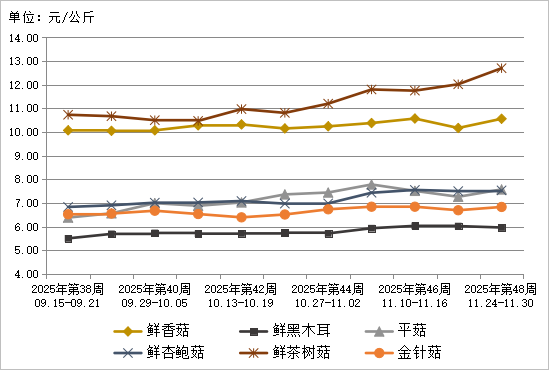 图8 2025年第48周6种食用菌鲜货批发市场价格走势