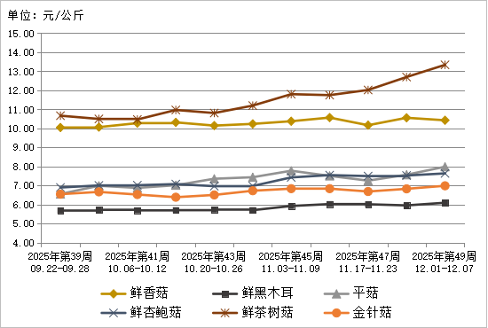 图8 2025年第49周6种食用菌鲜货批发市场价格走势