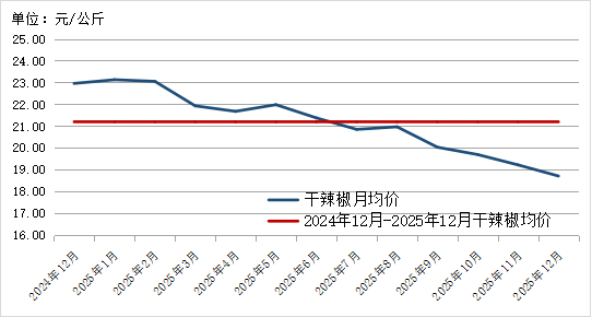 我省干辣椒月均价环比略有下跌,同比跌幅较大。12月新晒干椒供应量继续增加,市场待交易货源充足,终端需求稳中有增,干辣椒产品价格环比略有下跌。由于去年三季度干辣椒价格涨至高位,带动去年下半年价格水平高位,同比跌幅较大。