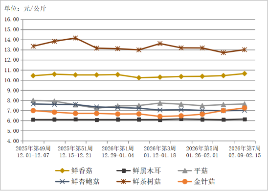 图8 2026年第7周6种食用菌鲜货批发市场价格走势