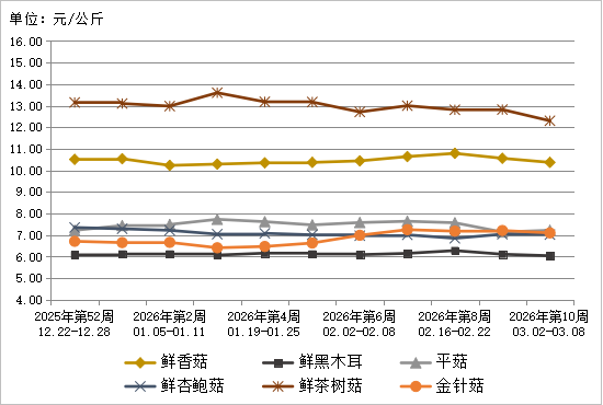 图8 2026年第10周6种食用菌鲜货批发市场价格走势
