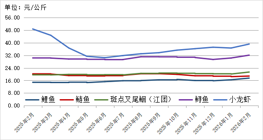 图11. 2025年2月-2026年2月5种水产品价格走势