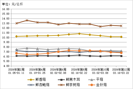 图8 2026年第12周6种食用菌鲜货批发市场价格走势