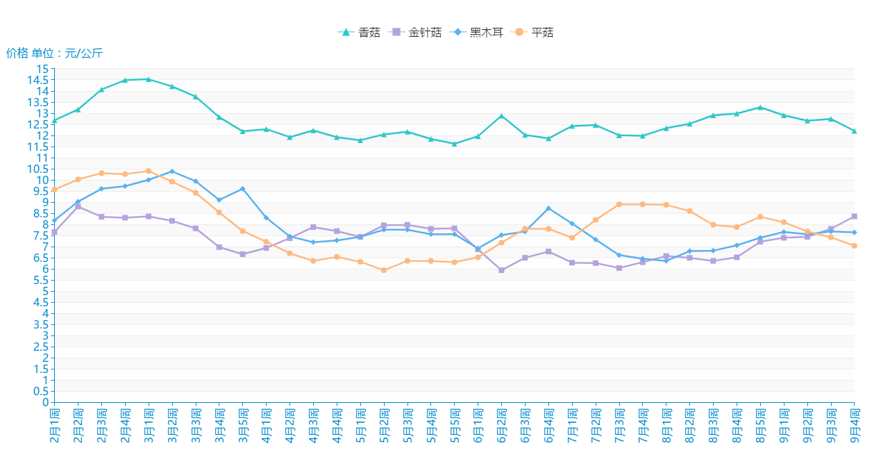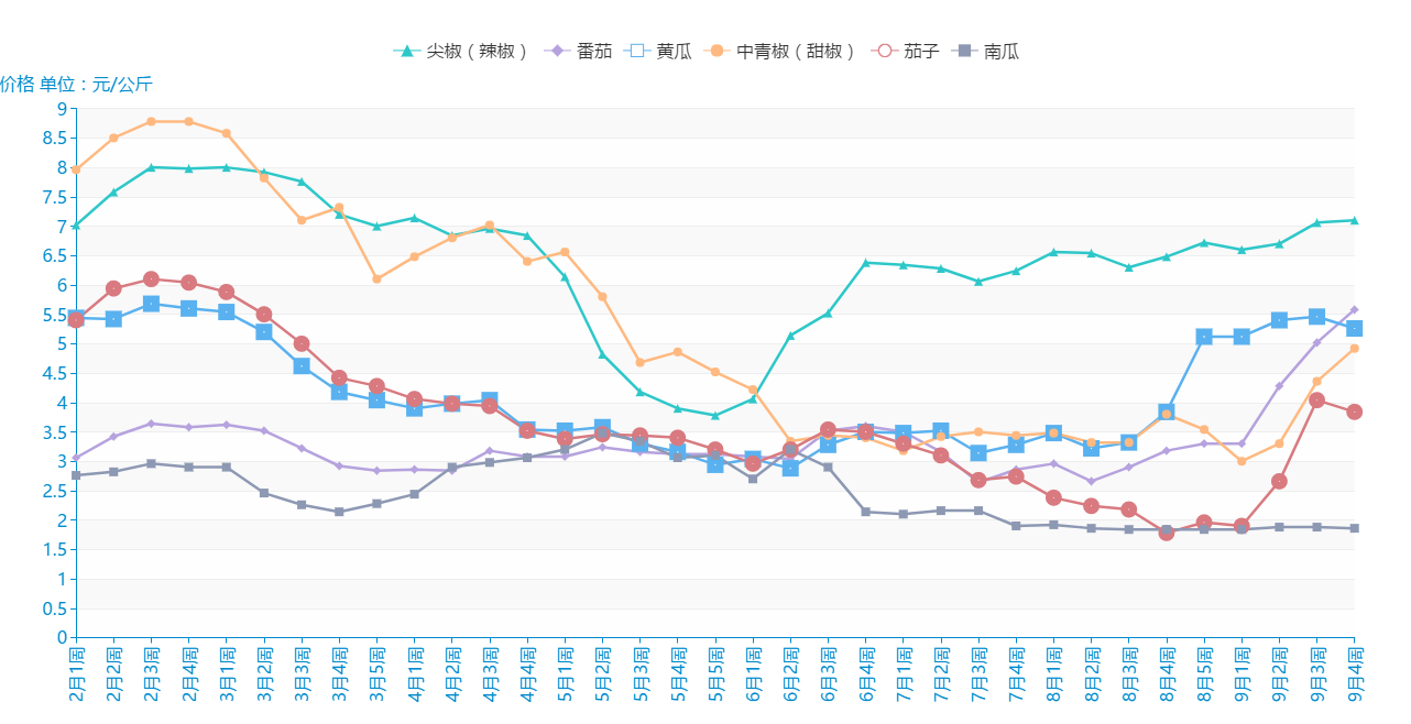 据全省9个批发市场蔬菜价格定点监测,9月第4周(9月23日-9月29日),22种蔬菜市场批发均价5.78元/公斤,环比上升0.35%,8种蔬菜批发价格上升,13种蔬菜批发价格下降,1种蔬菜批发价格稳定。其中中青椒、番茄价格上升较为明显,环比分别上升12.84%、10.71%;上海青、白萝卜、胡萝卜价格下降较为明显,环比分别下降9.88%、8.75%、10.92%。分品类看,叶菜类:大白菜2.12元/公斤,环比下降4.50%;莲花白1.68元/公斤,环比下降4.55%;广东菜心5.48元/公斤,环比下降1.44%;上海青4.38元/公斤,环比下降9.88%。根茎类:白萝卜1.46元/公斤,环比下降8.75%;胡萝卜4.08元/公斤,环比下降10.92%;土豆1.92元/公斤,环比为0.00%;生姜7.50元/公斤,环比上升1.90%;蒜头12.82元/公斤,环比上升4.74%。茄果、瓜类:青椒4.92元/公斤,环比上升12.84%;尖椒7.10元/公斤,环比上升0.57%;刺黄瓜5.26/公斤,环比下降3.66%;番茄5.58元/公斤,环比上升10.71%;茄子3.84元/公斤,环比下降5.42%;南瓜1.86元/公斤,环比下降1.06%。香细菜:蒜苗7.42元/公斤,环比上升5.10%;小葱7.48元/公斤,环比上升5.65%;芹菜6.94元/公斤,环比下降0.29%。菌类:香菇12.20元/公斤,环比下降4.24%;木耳7.64元/公斤,环比下降0.52%;平菇7.04元/公斤,环比下降5.12%;金针菇8.36元/公斤,环比上升7.18%。