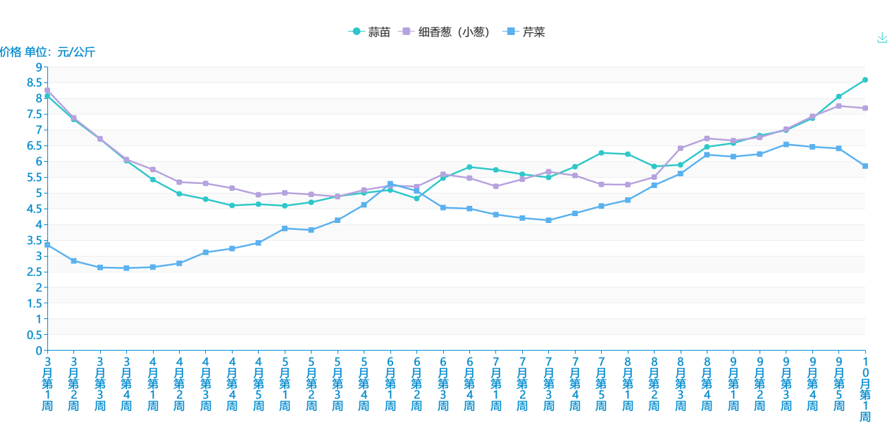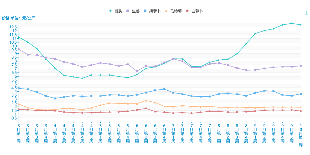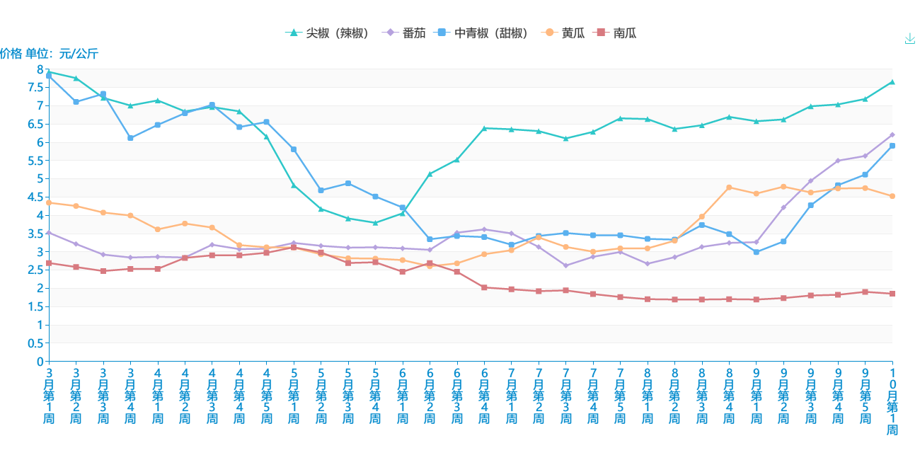 据全省9个批发市场蔬菜价格定点监测,10月第1周(10月07日-10月13日),22种蔬菜市场批发均价5.97元/公斤,环比上升1.70%,12种蔬菜批发价格上升,10种蔬菜批发价格下降。其中中青椒、番茄价格上升较为明显,环比分别上升16.28%、10.95%;上海青、白萝卜、芹菜价格下降较为明显,环比分别下降9.05%、15.28%、9.86%。分品类看,叶菜类:大白菜1.98元/公斤,环比下降7.48%;莲花白1.66元/公斤,环比上升6.41%;广东菜心6元/公斤,环比上升2.74%;上海青3.82元/公斤,环比下降9.05%。根茎类:白萝卜1.22元/公斤,环比下降15.28%;胡萝卜4.14元/公斤,环比上升7.25%;土豆1.9元/公斤,环比下降3.06%;生姜7.72元/公斤,环比上升3.76%;蒜头12.78元/公斤,环比下降1.39%。茄果、瓜类:青椒6元/公斤,环比上升16.28%;尖椒7.72元/公斤,环比上升7.52%;刺黄瓜5.22/公斤,环比上升1.56%;番茄6.28元/公斤,环比上升10.95%;茄子3.64元/公斤,环比上升7.69%;南瓜1.9元/公斤,环比下降3.06%。香细菜:蒜苗8.68元/公斤,环比上升6.11%;小葱7.64元/公斤,环比下降1.55%;芹菜6.22元/公斤,环比下降9.86%。菌类:香菇11.92元/公斤,环比下降1.32%;木耳8.1元/公斤,环比上升2.27%;平菇8.28元/公斤,环比上升7.81%;金针菇8.6元/公斤,环比下降1.60%。