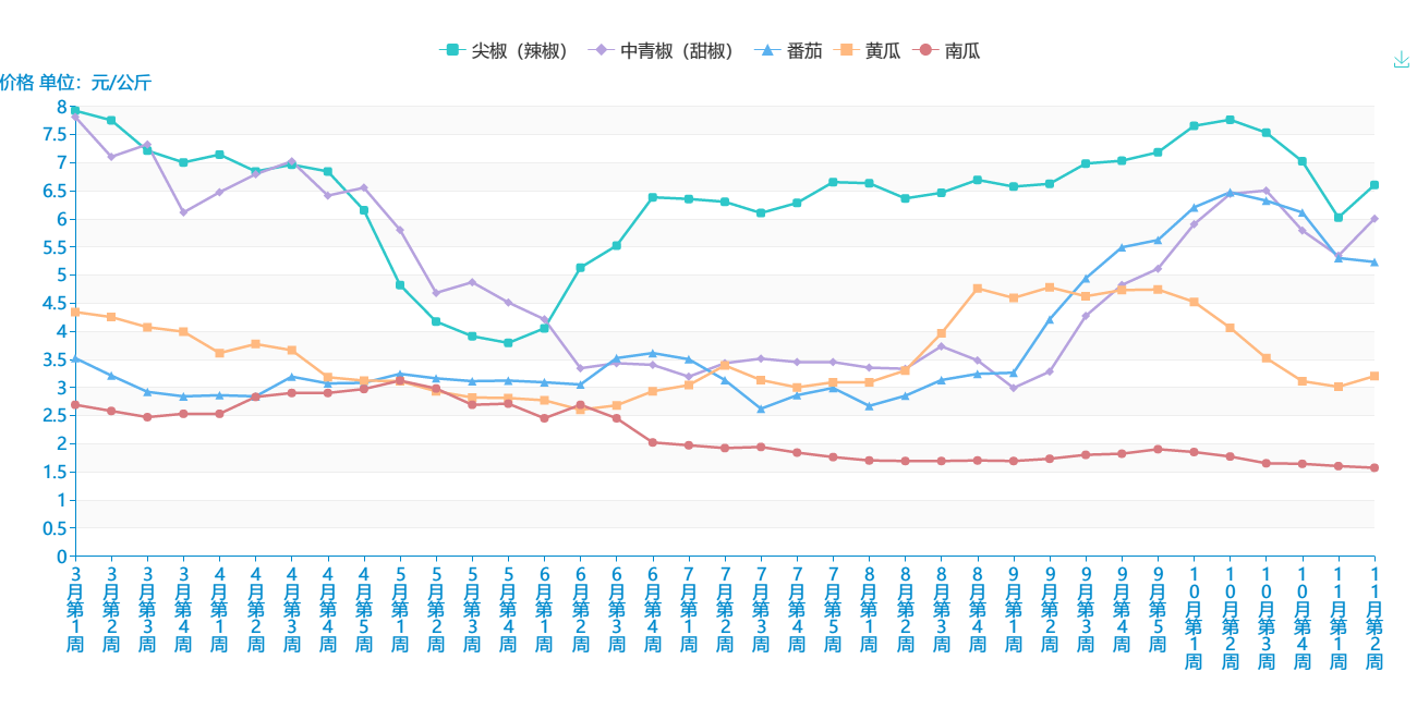 据全省9个批发市场蔬菜价格定点监测,11月第2周 (11月11日-11月17日),22种蔬菜市场批发均价5.17元/公斤,环比上升0.58%,9种蔬菜批发价格上升,12种蔬菜批发价格下降,一种蔬菜批发价格保持稳定。其中中青椒、红尖椒价格上升较为明显,环比分别上升11.85%、9.54%;大白菜、土豆价格下降较为明显,环比分别下降7.46%、7.07%。分品类看,叶菜类:大白菜1.24元/公斤,环比下降7.46%;莲花白1.46元/公斤,环比上升2.82%;广东菜心3.1元/公斤,环比下降3.13%;上海青2.84元/公斤,环比上升0.71%。根茎类:白萝卜1.18元/公斤,环比下降4.84%;胡萝卜3.2元/公斤,环比下降4.19%;土豆1.84元/公斤,环比下降7.07%;生姜8.06元/公斤,环比下降0.49%;蒜头14.42元/公斤,环比上升1.12%。茄果、瓜类:中青椒6.04元/公斤,环比上升11.85%;尖椒6.66元/公斤,环比上升9.54%;刺黄瓜3.74/公斤,环比上升5.06%;番茄5.26元/公斤,环比下降1.50%;茄子4元/公斤,环比上升7.53%;南瓜1.64元/公斤,环比下降2.38%。香细菜:蒜苗6.72元/公斤,环比下降4.82%;小葱6.3元/公斤,环比下降1.56%;芹菜4.5元/公斤,环比上升2.74%。菌类:香菇11.04元/公斤,环比上升1.28%;木耳6.86元/公斤,环比下降1.44%;平菇8.36元/公斤,环比为0.00%;金针菇5.38元/公斤,环比下降3.93%。