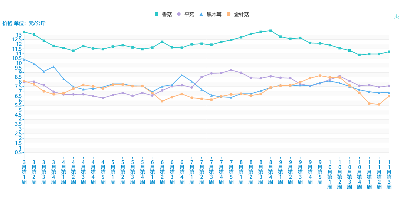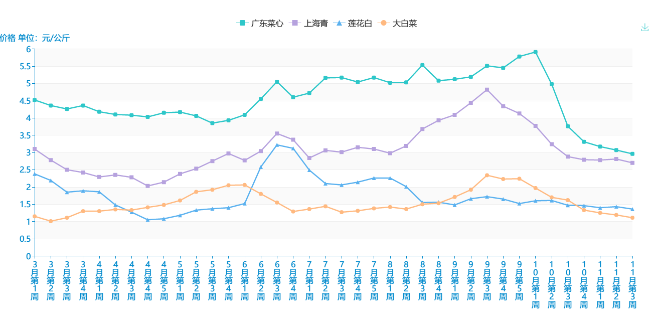 据全省9个批发市场蔬菜价格定点监测,11月第3周(11月18日-11月24日),22种蔬菜市场批发均价5.19元/公斤,环比上升0.39%,8种蔬菜批发价格上升,14种蔬菜批发价格下降。其中金针菇价格上升较为明显,环比分别上升18.59%;土豆价格下降较为明显,环比分别下降9.78%。分品类看,叶菜类:大白菜1.22元/公斤,环比下降1.61%;莲花白1.38元/公斤,环比下降5.48%;广东菜心2.98元/公斤,环比下降3.87%;上海青2.74元/公斤,环比下降3.52%。根茎类:白萝卜1.16元/公斤,环比下降1.69%;胡萝卜3.18元/公斤,环比下降0.63%;土豆1.66元/公斤,环比下降9.78%;生姜7.9元/公斤,环比下降1.99%;蒜头14.2元/公斤,环比下降1.53%。茄果、瓜类:中青椒5.98元/公斤,环比下降0.99%;尖椒7.1元/公斤,环比上升6.61%;刺黄瓜3.88元/公斤,环比上升3.74%;番茄4.96元/公斤,环比下降5.70%;茄子3.78元/公斤,环比上升下降5.50%;南瓜1.62元/公斤,环比下降1.22%。香细菜:蒜苗6.26元/公斤,环比下降6.85%;小葱6.38元/公斤,环比上升1.27%;芹菜4.58元/公斤,环比上升1.78%。菌类:香菇11.22元/公斤,环比上升1.63%;木耳6.92元/公斤,环比上升0.87%;平菇8.64元/公斤,环比为上升3.35%;金针菇6.38元/公斤,环比上升18.59%。