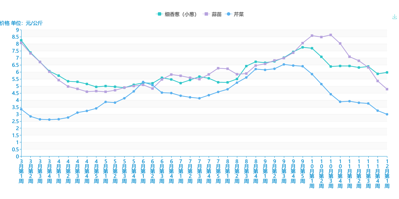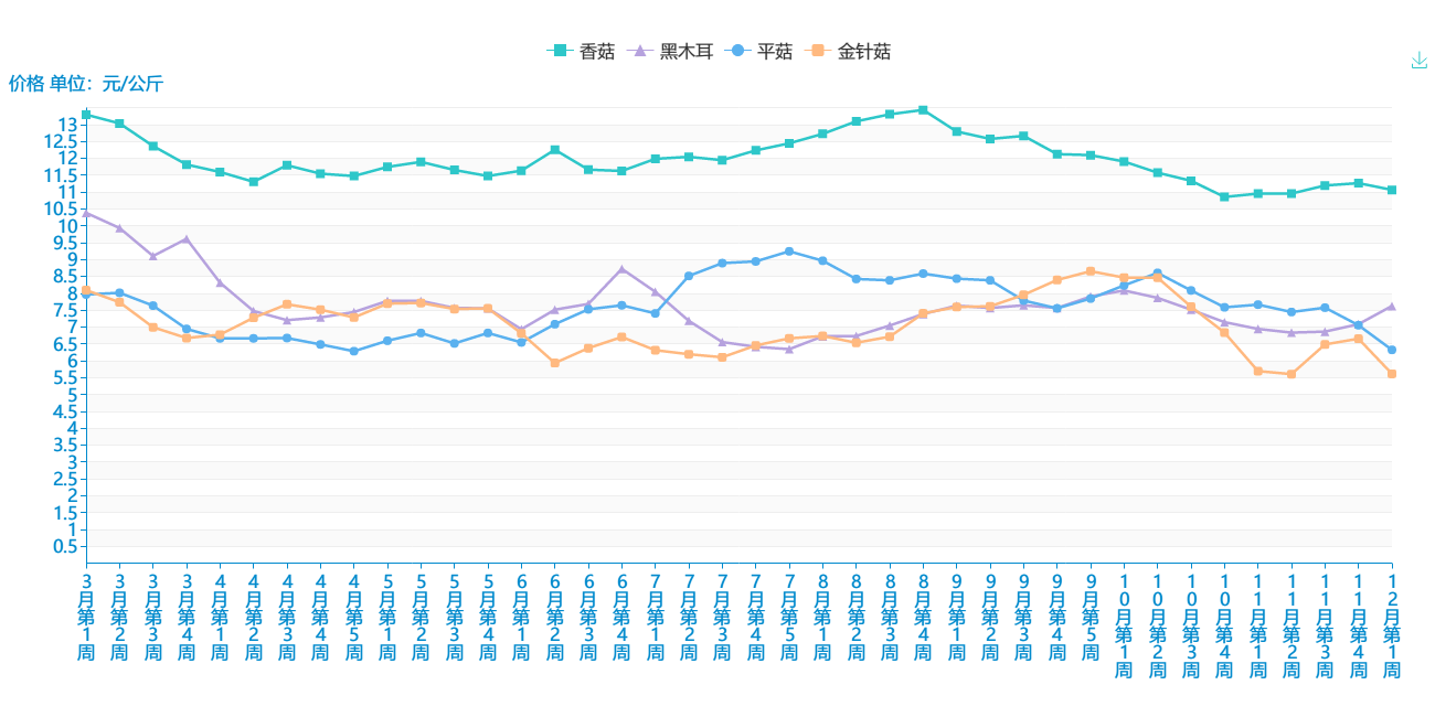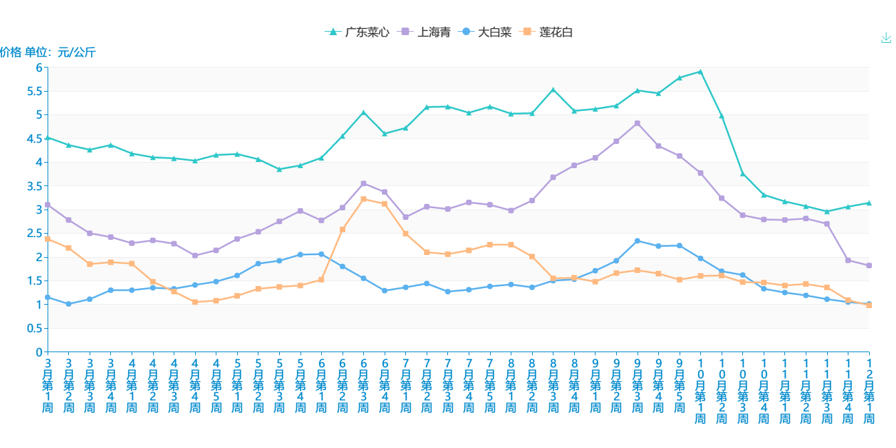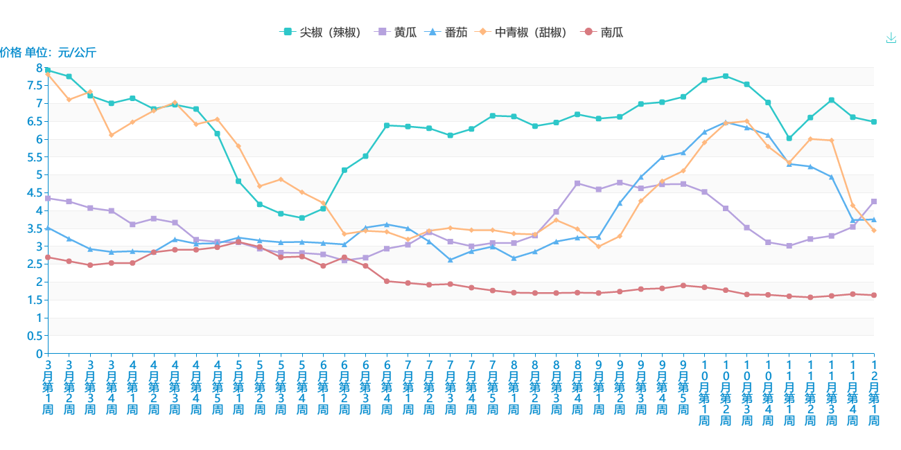 据全省9个批发市场蔬菜价格定点监测,12月第1周(12月02日-12月08日),22种蔬菜市场批发均价4.57元/公斤,环比下降4%,6种蔬菜批发价格上升,15种蔬菜批发价格下降,1种蔬菜批发价格保持稳定。其中刺黄瓜价格上升较为明显,环比分别上升17.87%;莲花白、中青椒、蒜苗、芹菜、平菇、金针菇价格下降较为明显,环比分别下降10.71%、16.43%、12.41%、13.30%、14.67%、15.95%。分品类看,叶菜类:大白菜1.02元/公斤,环比下降3.77%;莲花白1元/公斤,环比下降10.71%;广东菜心3.22元/公斤,环比上升3.87%;上海青1.84元/公斤,环比下降7.07%。根茎类:白萝卜0.96元/公斤,环比为0.00%;胡萝卜2.22元/公斤,环比下降8.26%;土豆1.98元/公斤,环比上升7.61%;生姜7.02元/公斤,环比下降3.04%;蒜头12.98元/公斤,环比下降2.99%。茄果、瓜类:中青椒3.46元/公斤,环比下降16.43%;尖椒6.54元/公斤,环比下降1.21%;刺黄瓜4.88元/公斤,环比上升17.87%;番茄3.82元/公斤,环比上升2.69%;茄子2.92元/公斤,环比下降8.18%;南瓜1.72元/公斤,环比下降4.44%。香细菜:蒜苗4.66元/公斤,环比下降12.41%;小葱5.86元/公斤,环比上升0.69%;芹菜3.26元/公斤,环比下降13.30%。菌类:香菇11.08元/公斤,环比下降2.98%;木耳7.7元/公斤,环比上升8.45%;平菇6.98元/公斤,环比下降14.67%;金针菇5.48元/公斤,环比下降15.95%。